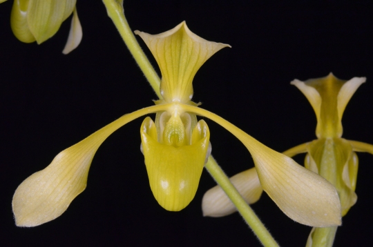| Description: Three flowers and four buds on one 64-cm upright unsupported inflorescence; dorsal sepal recurved, light chartreuse, darker centrally and basally, darker veins; synsepal ovate-epiculate, recurved centrally, cream, striped light green; petals spatulate, pale chartreuse, lighter distally; pouch light chartreuse; staminode light chartreuse, darker centrally; substance medium; texture matte, pouch waxy. |