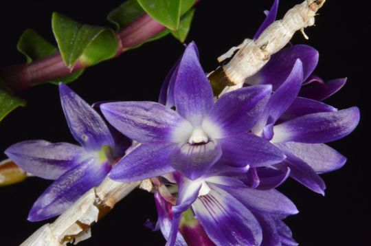 | Description: Forty flowers and one bud on 12 simultaneous 5-cm inflorescences; sepals and petals narrowly ovate, dark vibrant blue-purple, white basally; lip vibrant dark blue-purple, white basally, veined dark purple; column and anther cap pale green; substance medium; texture glossy. |