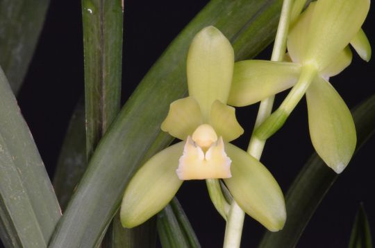 | Description: Five flowers and seven buds on two up to 26.5-cm inflorescences and one immature inflorescence; sepals lanceolate, light green, darker green distally; petals porrect, light green; lip ovate, slightly ruffled mid-lobe, reflexed tip; column cream overlaid light chartreuse, anther cap yellow; substance firm; texture waxy. |