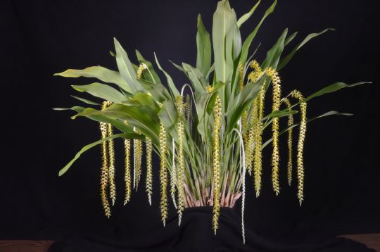 | Description: Approximately 1679 flowers and approximately 528 buds on 28 up to 64-cm inflorescences; well-grown compact 86-cm x 65-cm plant in a 15-cm standard plastic pot; sepals and petals lanceolate, green-yellow; lip orange, striped green centrally; substance firm; texture matte. |
