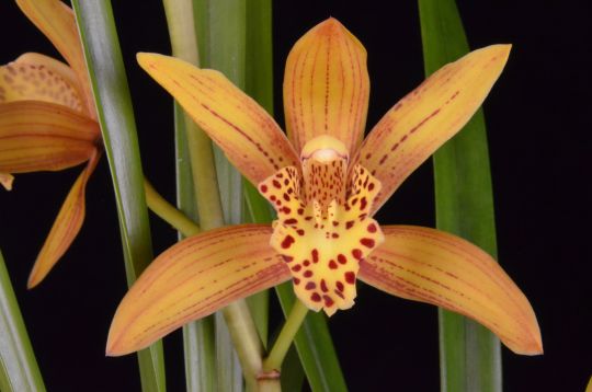 | Description: Four stellate flowers and 13 buds on two up to 66-cm inflorescences; flower gold; dorsal sepal lanceolate, hooded, striped burgundy; lateral sepals lanceolate, striped burgundy; petals narrowly lanceolate, striped and spotted burgundy; lip trilobed, heavily spotted burgundy; column yellow, spotted burgundy underside, anther cap yellow; substance firm; texture matte, lip velvet. |