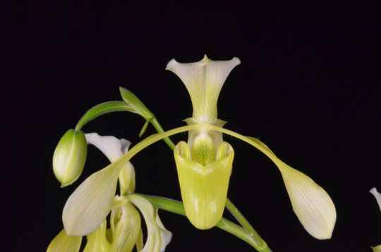| Description: Three flowers and one bud on one 48-cm arched inflorescence; dorsal sepal cream, veined light green, flushed light green basally; synsepal cream, scant few light green veins; petals elongated spatulate, cream, flushed faint yellow basally, shades to cream apically; pouch bright light green, faint green stripe; staminode pale green, veined dark green; substance average; texture satin, pouch waxy. |