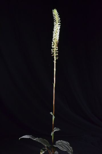 | Description: An estimated 100 non-resupinate flowers and 50 buds on an unstaked upright inflorescence 55 cm in length; grown in bark in an 8-cm plastic pot, plant 8 cm tall, 23 cm wide, five leaves in rosette, dark green leaves up to 13 cm in length, wide longitudinal silver stripes, margins undulate; sepals and petals white; lip white spotted dark green; substance firm; texture matte; recognized for rarity and foliage markings. |