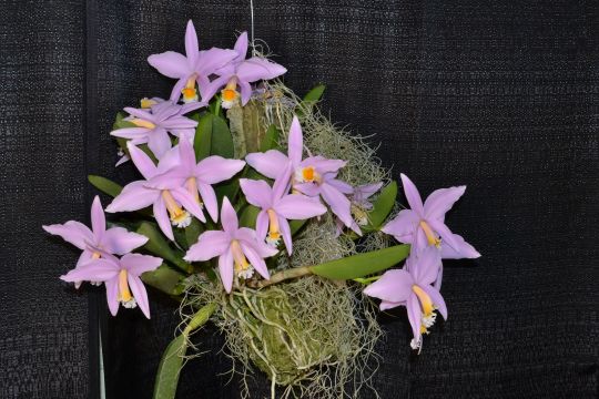 | Description: Twenty stellate flowers on ten up to 16-cm inflorescences; plant mounted on a cork slab 36 cm x 18 cm, plant width 53 cm, height 44 cm; sepals and petals broadly lanceolate, lavender-pink; lip tubular, white, undulate margin, throat yellow-orange, seven yellow-orange keels; column white, anther cap white; substance average; texture crystalline. |