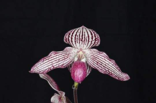 | Description: Two well-presented flowers on one 25-cm staked inflorescence; sepals ovoid acute, white veined burgundy; petals lanceolate, angled downward, margin undulate, white veined burgundy, darker at tips; pouch white heavily overlaid light burgundy, darker veins; staminode white overlaid burgundy margin to apex, green centrally; substance firm; texture matte. |