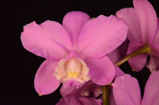 | Five relatively flat, upright, bright pink flowers on one 23-cm, unsupported inflorescence; sepals elliptical, tipped green apically; petals widely elliptical, raised midrib basal half; lip ruffled, pink apical edge, overlaid cream, blushed pink, side lobes enclose column; column and anther cap white; substance firm; texture satiny. |