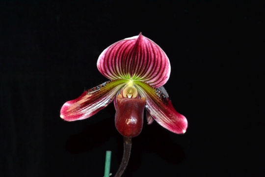 | Description: One flower and one bud on one upright 35.5-cm inflorescence; sepals white, green basally, overlaid red-burgundy, deeper burgundy veins; petals green, darker green veins basally, red-burgundy apical three-forths, deep burgundy spots basal half, dense on basal superior margin; pouch red-burgundy, dark burgundy veins; staminode cream, olive green veins; substance firm; texture glossy. |