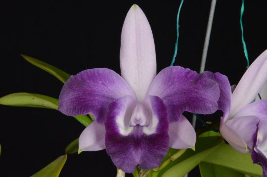| Description: Four flowers on two up to 15.2-cm supported inflorescences; sepals lanceolate, pale lavender; petals ovate, pale lavender overlaid dark purple distally; lip oval, cleft, slightly ruffled, pale lavender overlaid dark purple distally and center stripe, throat white; column white blushed pale lavender, anther cap dark purple; substance medium-firm; texture matte. |