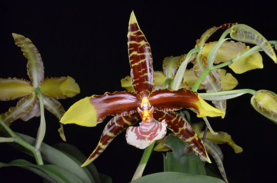 | Description: Eight flowers and eight buds on three up to 36-cm upright inflorescences; sepals lanceolate, slightly undulate edges, light yellow, broadly barred light chestnut brown; petals broadly lanceolate, slightly undulate edges, yellow, proximal two-thirds rich chestnut brown; lip orbicular, pinched proximally, cream, overlaid light chestnut brown barring proximal half, margins blotched light chestnut brown, callus golden yellow, lightly barred chestnut brown; column yellow, anther cap white; substance firm; texture glossy, lip satin. |