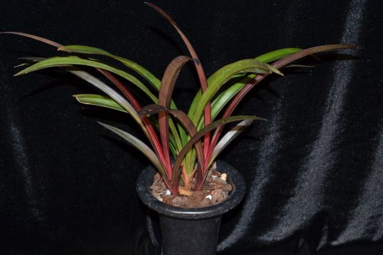| Award to plant without blooms. Commended for attractive mahogany color of emerging growths. Color transitions to green as growth mature with residual mahogany flecks, margin and midrib. |