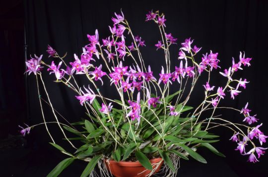 | Description: One hundred three slightly cuppy flowers and seven buds on 39 up to 70-cm inflorescences; plant 138 cm wide by 24 cm tall, in round plastic 58-cm pot, grown in bark; sepals lanceolate, lavender; petals peloric, undulate margins, cream overlaid fuchsia, intense fuchsia margins, fushia veins, white splash center; lip tri-lobed, midlobe intense fuchsia, side lobes intense fuchsia margins, cream veined fuchsia basally, throat yellow; column cream marked fuchsia, anther cap white; substance medium; texture matte; four flowers were not peloric. |