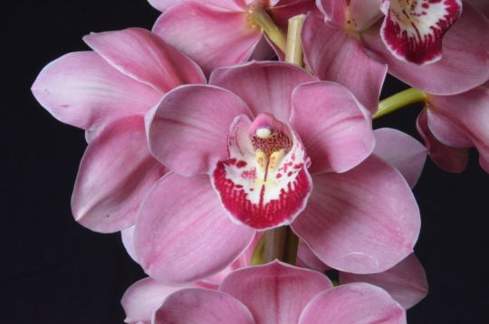 | Description: Nine flowers arranged on one 59-cm inflorescence;  sepals and petals soft pink, lightly veined darker rose, mid-vein heavier, narrow cream margins; lip cream, apically crimson, cream margin, keels yellow spotted red; column dark red, anther cap cream; substance firm; texture matte. |