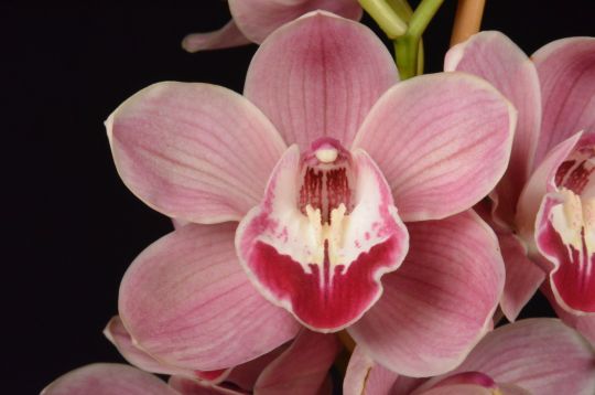| Description: Nine large, round, slightly cupped flowers on one staked 83-cm inflorescence; sepals and petals ovate, cream blushed light rose, veined darker rose; lip white, mid-lobe boldly barred saturated dark rose, side lobes edged light rose; column white overlaid rose; substance very firm; texture matte. |